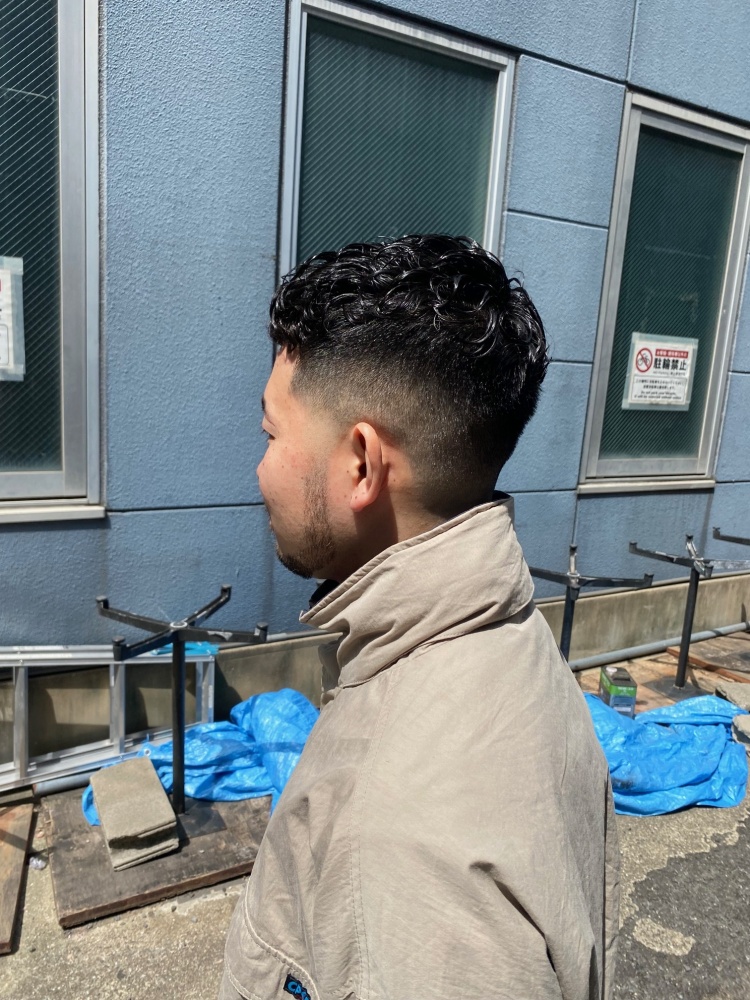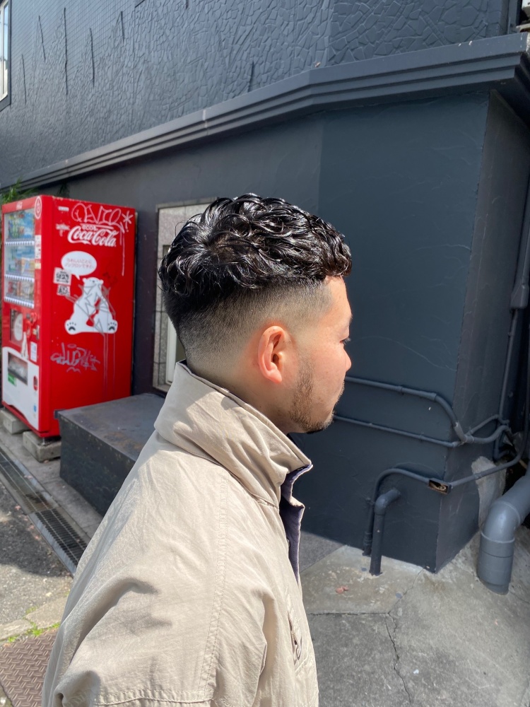 このスタイルは、フェードの高さやパーマの強さによって雰囲気が変わってくるのでそこはお客様の好みによって変えてます。